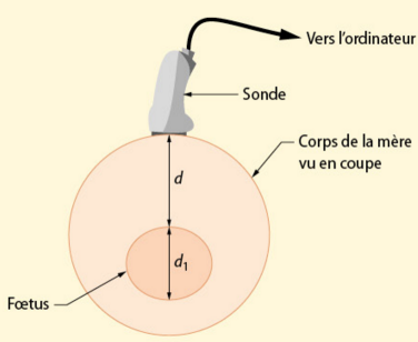 L'onde ultrasonore parcours une distance égale à deux fois la distance qui sépare la sonde du fœtus pendant une durée Δt (durée d'un aller-retour, temps écoulé entre l'émission et la réception des ultrasons).