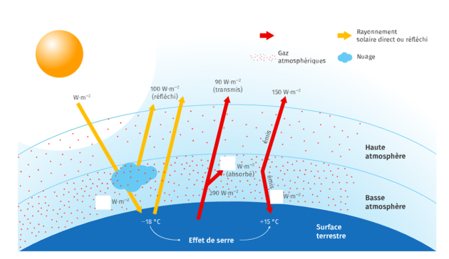 L'effet de serre est un phénomène naturel dû à la présence de différents gaz dans l'atmosphère terrestre (vapeur d'eau, dioxyde de carbone, méthane...) qui provoquent une augmentation de la température à la surface de la Terre.