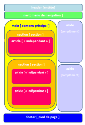 Le langage HTML 5 a même introduit certaines balises spécifiques que l'on peut appeler "balises sémantiques" qui vont permettre de structurer en profondeur une page web (certains navigateurs ou moteurs de recherche pourront alors obtenir des renseignements plus spécifiques) :
